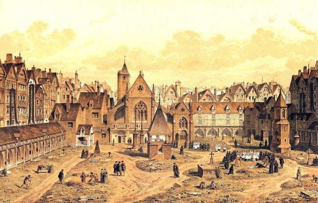 | Cmentarz Świętych Niewiniątek w Paryżu, około 1550 roku.* Domena publiczna |